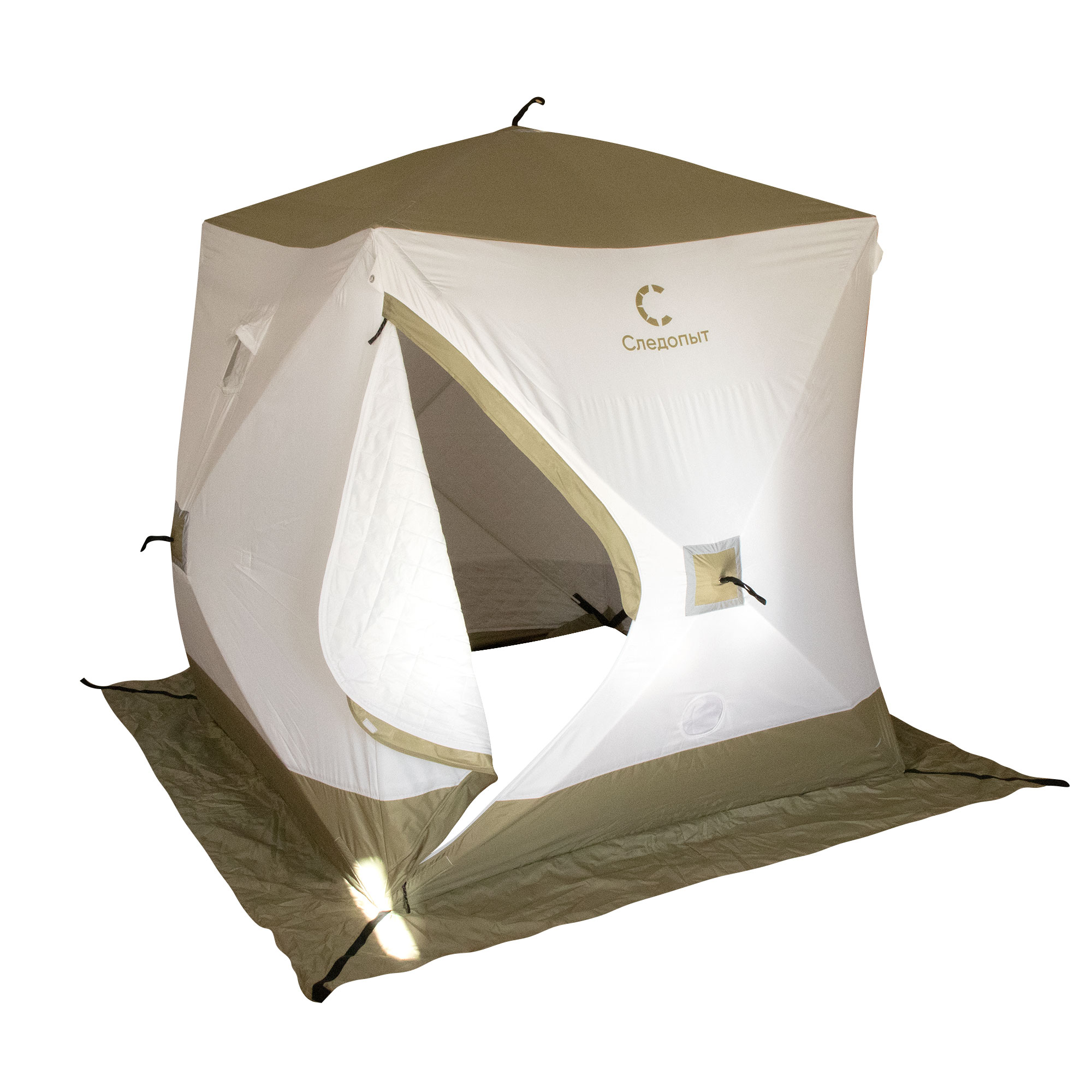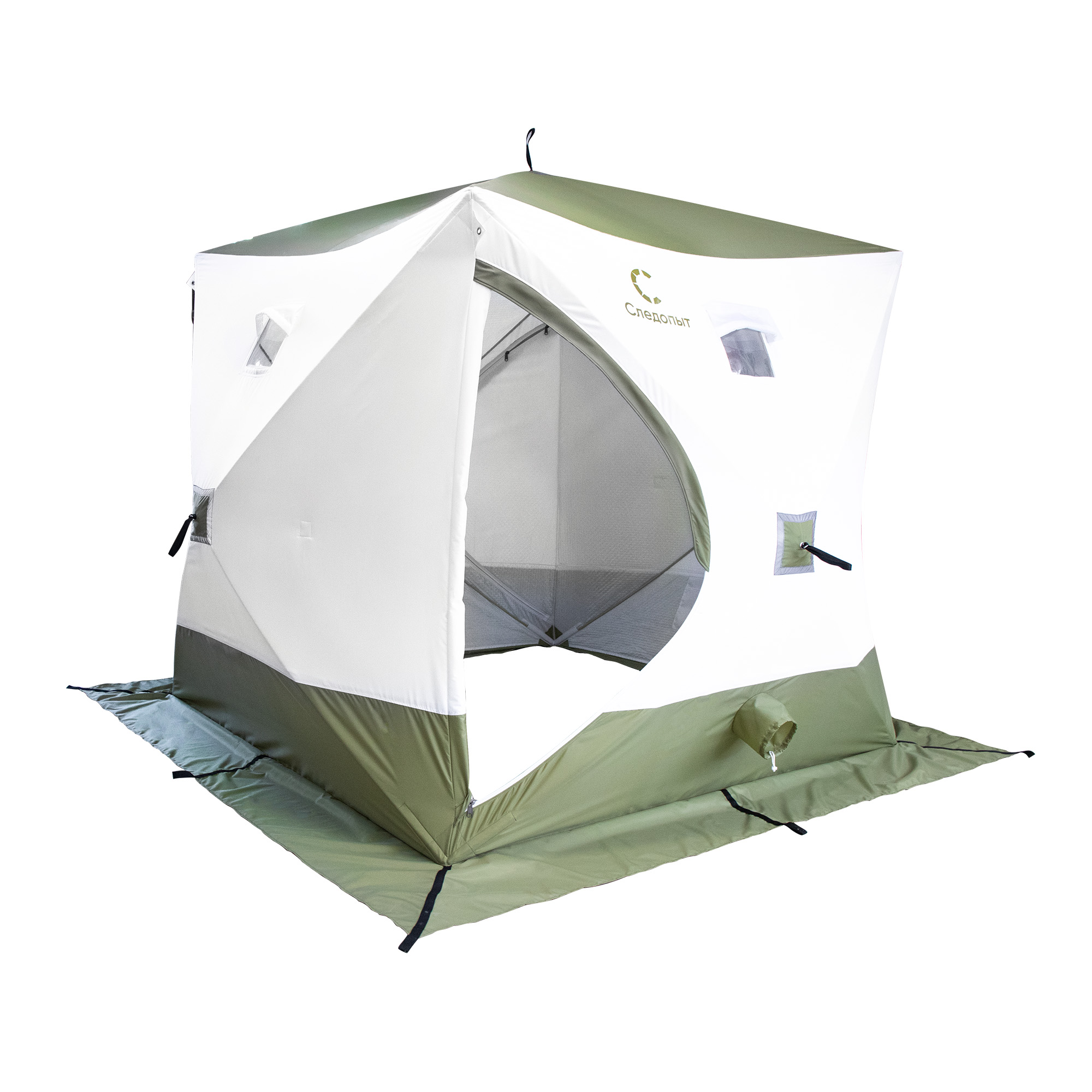 Палатка зимняя куб СЛЕДОПЫТ "Premium" 2,1х2,1 м, S по полу 4,4 кв.м, 3 слоя, 2 двери, цв. олив/бел