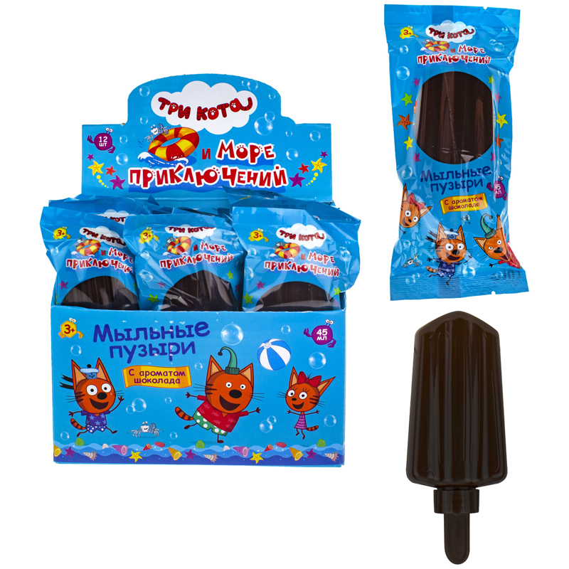 Мыльные пузыри 1toy "Три кота", 45мл, эскимо с шоколад. ароматом на палочке в цвет. обертке