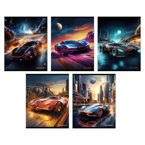 Тетрадь А5 48л " Альфа-Тренд " клетка Космические тачки (ассорти), клетка, офсет, на скобе, обложка - мелованный картон, УФ-лак, скругленные углы, 5 дизайнов