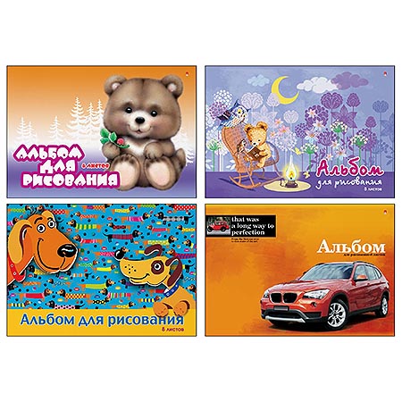 Альбом А4 8л " Альт " Мультики (ассорти), на скобе, обложка - мелованный картон, выборочный лак, блок офсет 100г/м2, 4 дизайна