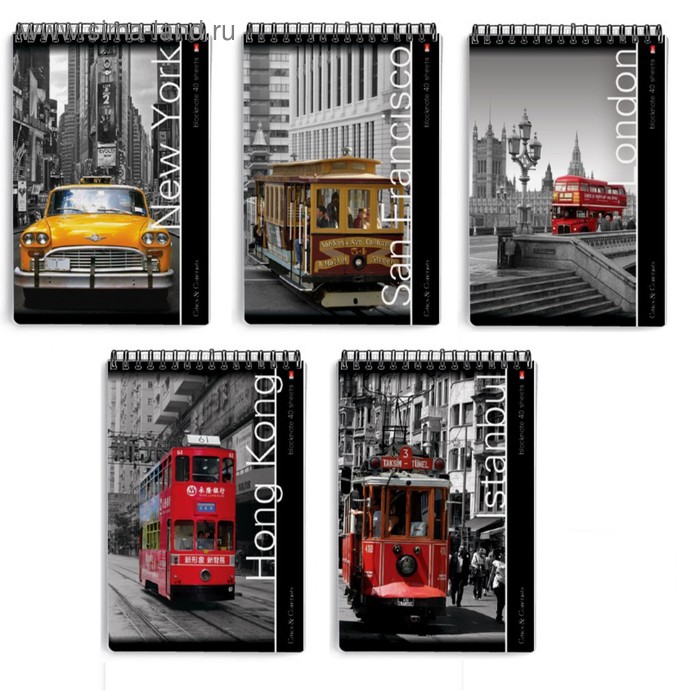 Блокнот А6, 40 листов на гребне "Города", картонная обложка, блок офсет 55 г/м², МИКС