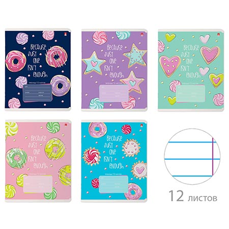 Тетрадь А5 12л " Альт " линия Сладкое настроение (ассорти), офсет, на скобе, обложка - мелованный картон, конгрев, скругленные углы, 5 дизайнов
