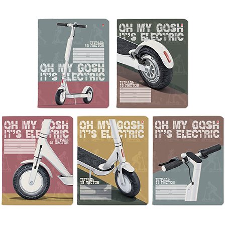 Тетрадь А5 18л " Альт " линия Самокат (ассорти), офсет, на скобе, обложка - мелованный картон, выборочный УФ-лак, конгрев, скругленные углы, 5 дизайнов