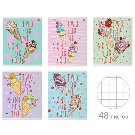 Тетрадь А5 48л " Альт " Мороженое, клетка, блок - офсет 60г/м2, на скобе, обложка- мелованный картон, матовая ламинация Soft Touch, фольга красная, скругленные углы, 5 дизайнов