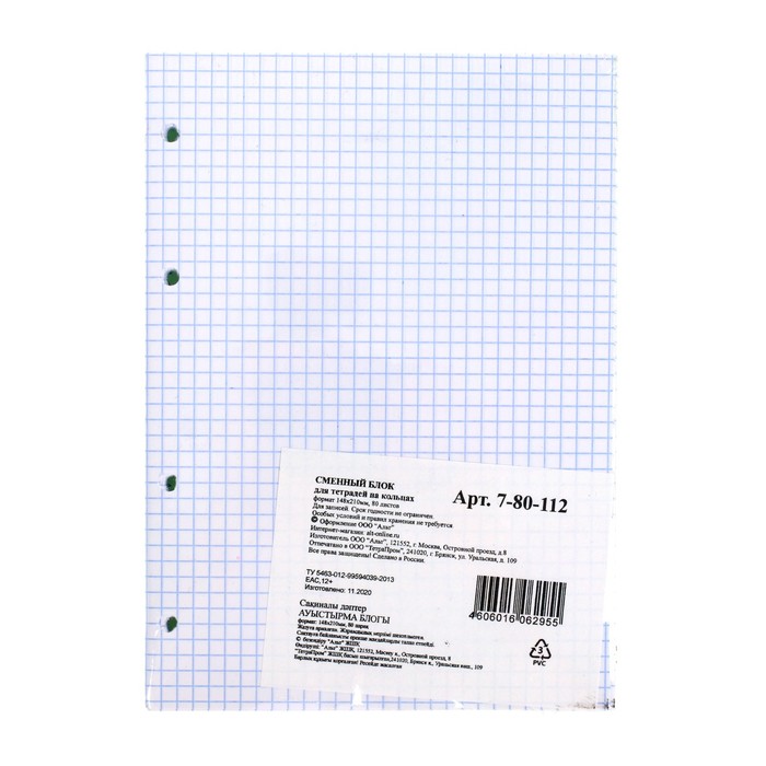 Сменный блок для тетрадей на кольцах А5, 80 листов в клетку, белый, 60 г/м2