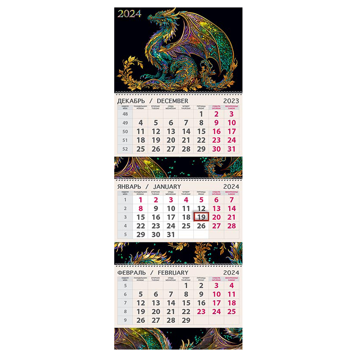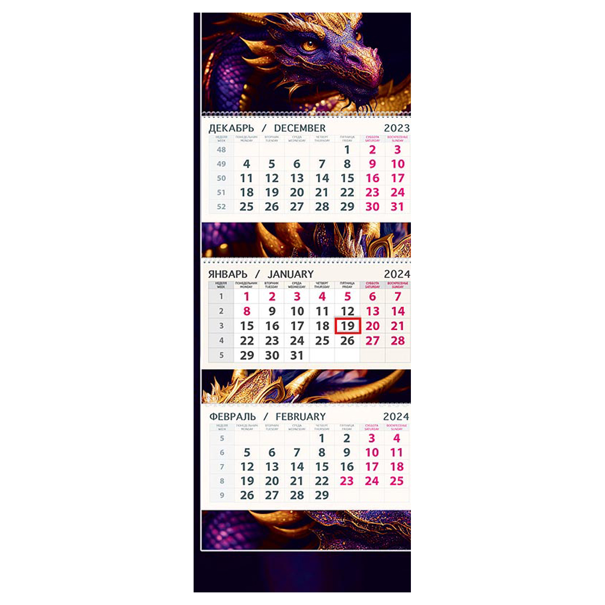 Календарь квартальный 3 бл. на 3 гр. Арт и Дизайн "Дракон", с бегунком, 2024г, фольга