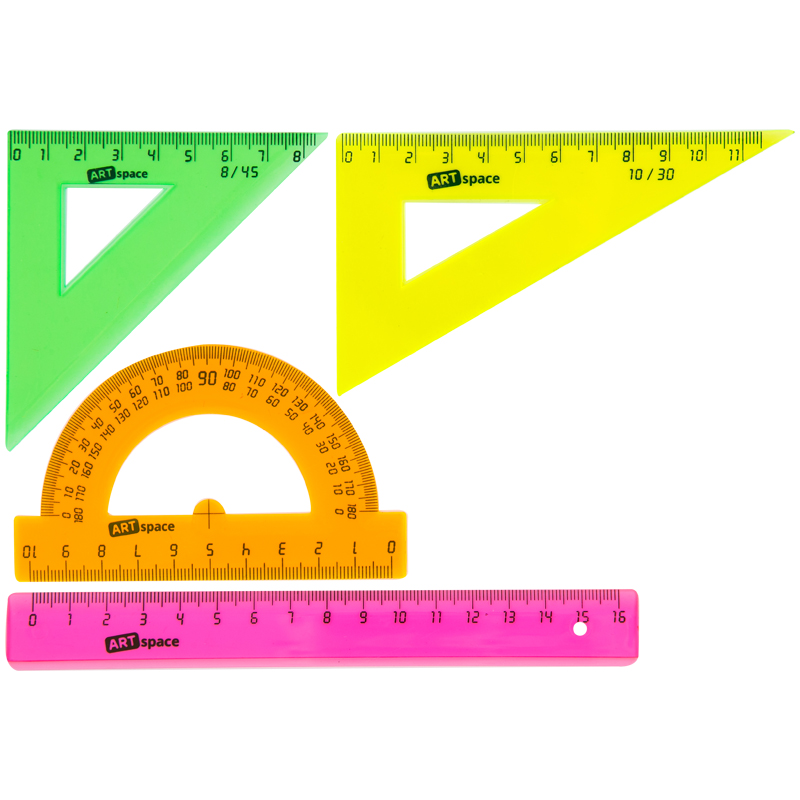 Набор чертежный малый ArtSpace, (треуг. 2шт., линейка 16см, транспортир), прозр. флуоресцентный