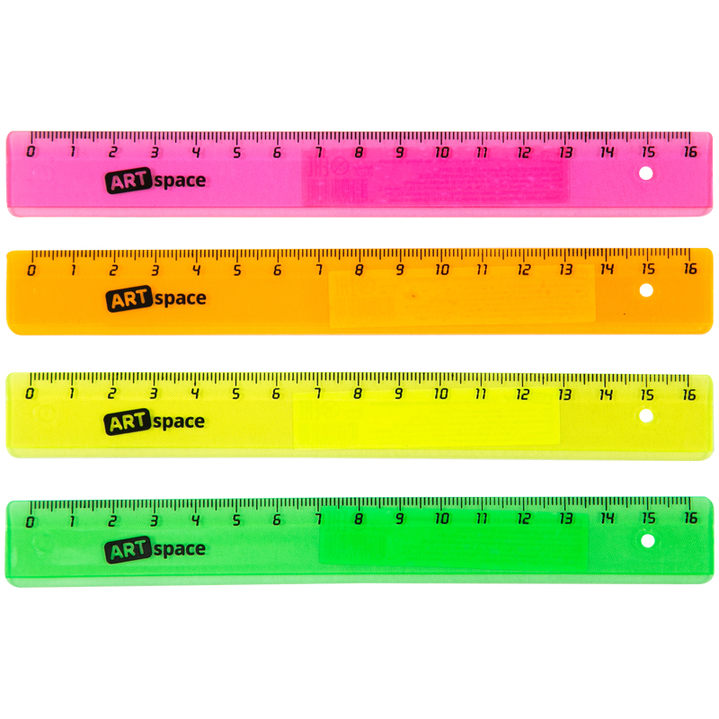 Линейка 16см ArtSpace, пластиковая, прозрачная флуоресцентная, ассорти