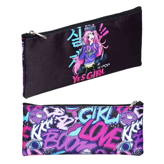 Пенал мягкий, 1 отделение, 90 х 215 х 10 мм, плоский, Attomex "Yes Girl" чёрный 7024425