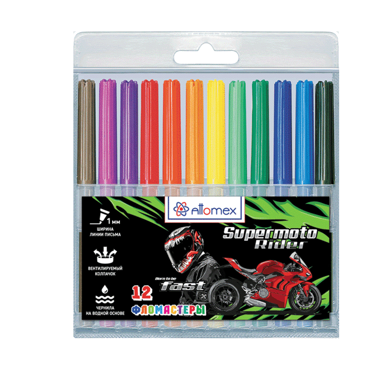 Фломастеры 12 цветов "Super Moto" вентилируемый колпачок, смываемые, ПВХ упаковка е/п