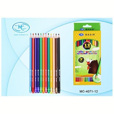 Карандаши " Basir " Мишка 12цв шестигранные, с ластиком, пластиковые, картонная упаковка, европодвес, в дисплее