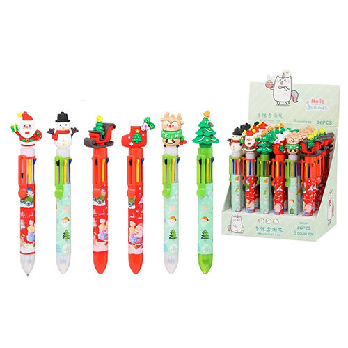 Ручка шариковая автоматическая " Basir " Новогодние, 8-цветная, ассорти, без возможности выбора цвета, прорезиненный наконечник фигурка- Дед Мороз, ёлка, сапог, снеговик, олененок,сани, цветной корпус с рисунком, в картонном дисплее
