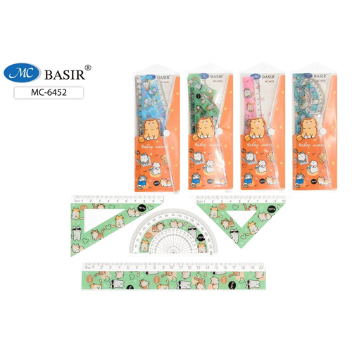 Набор линеек " Basir " Кошки пластиковая, 4 предмета: 2 треугольника, транспортир, линейка 20см, ПВХ-конверт на кнопке