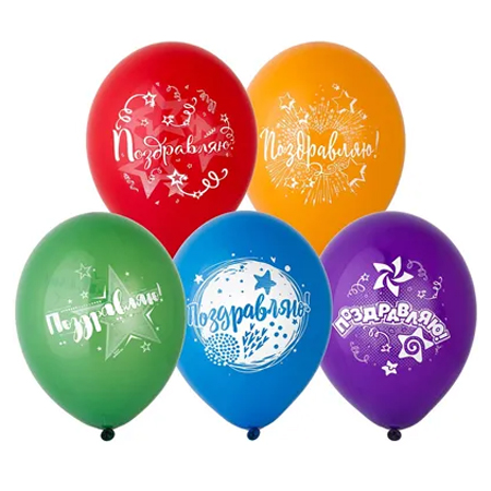 Шар латексный с рисунком 12"/30см Поздравляю! ассорти из 5 цветов, 5 дизайнов