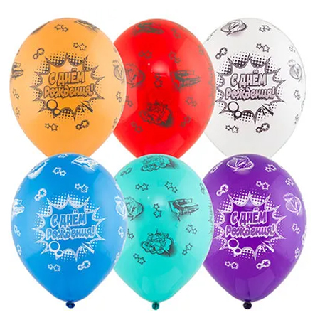 Шар латексный шелкография 14"/36см С Днем рождения! Комиксы, ассорти из 6 цветов