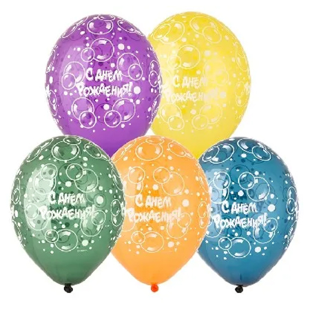 Шар латексный шелкография 14"/36см С Днем рождения! Пузыри, ассорти из 5 цветов