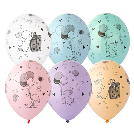Шар латексный шелкография 14"/36см Зайчик, ассорти из 6 цветов, 2 дизайнов