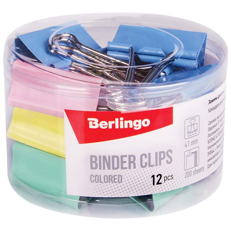 Зажимы для бумаг 41мм, Berlingo, 12шт., цветные, пластиковый тубус