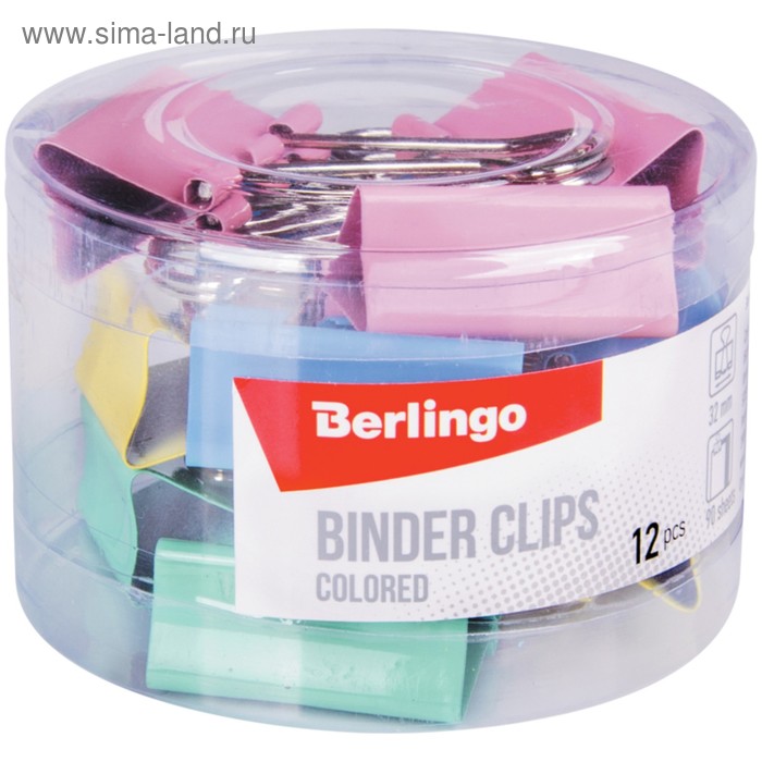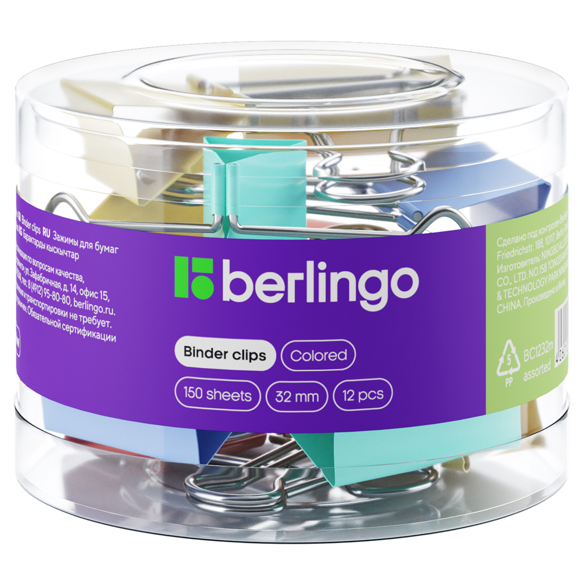 Набор зажимов для бумаг 32мм, 12 штук Berlingo, цветные, в пластиковом тубусе