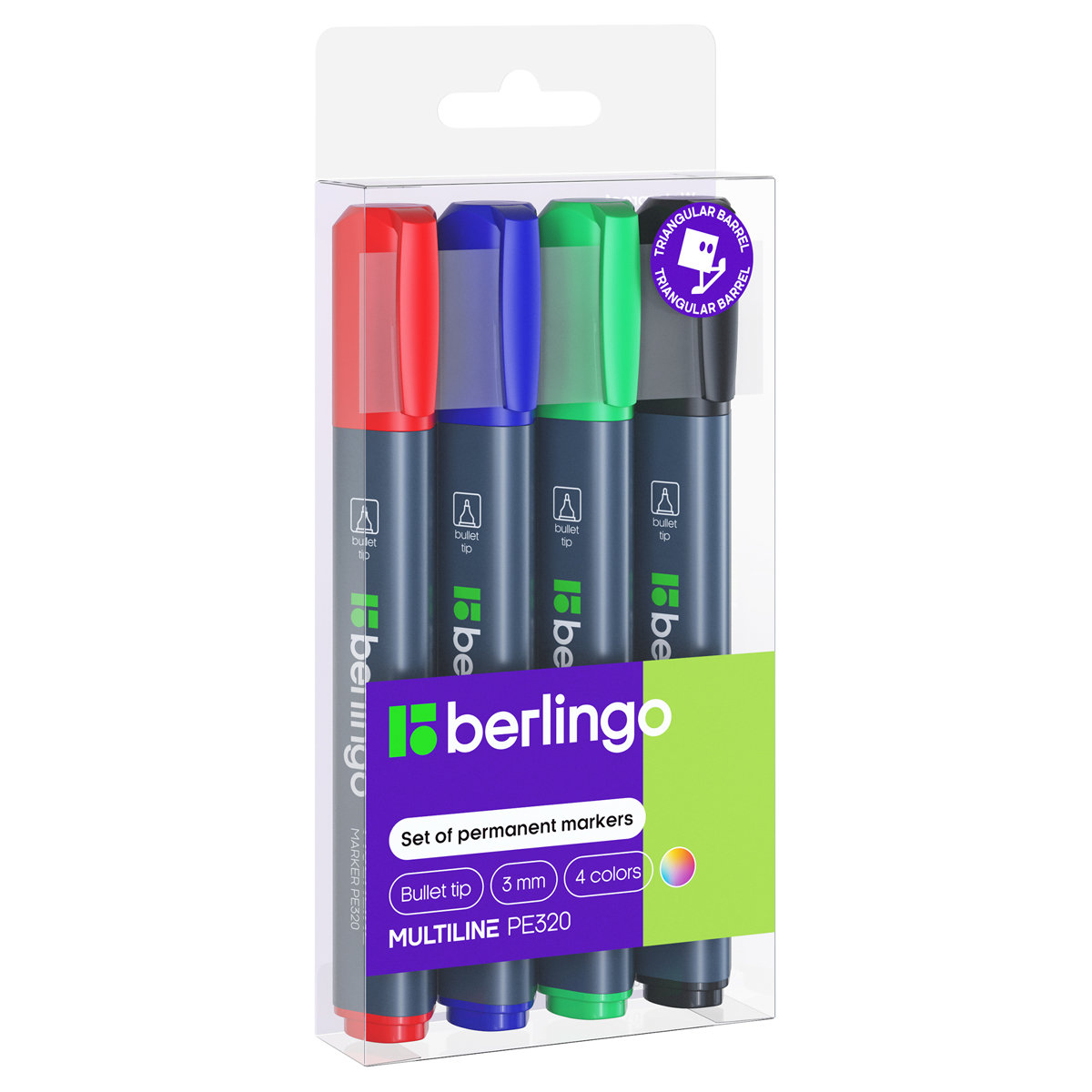 Набор перманентных маркеров Berlingo "MultiLine PE320" 04цв., пулевидный, трехгранный, 3,0мм