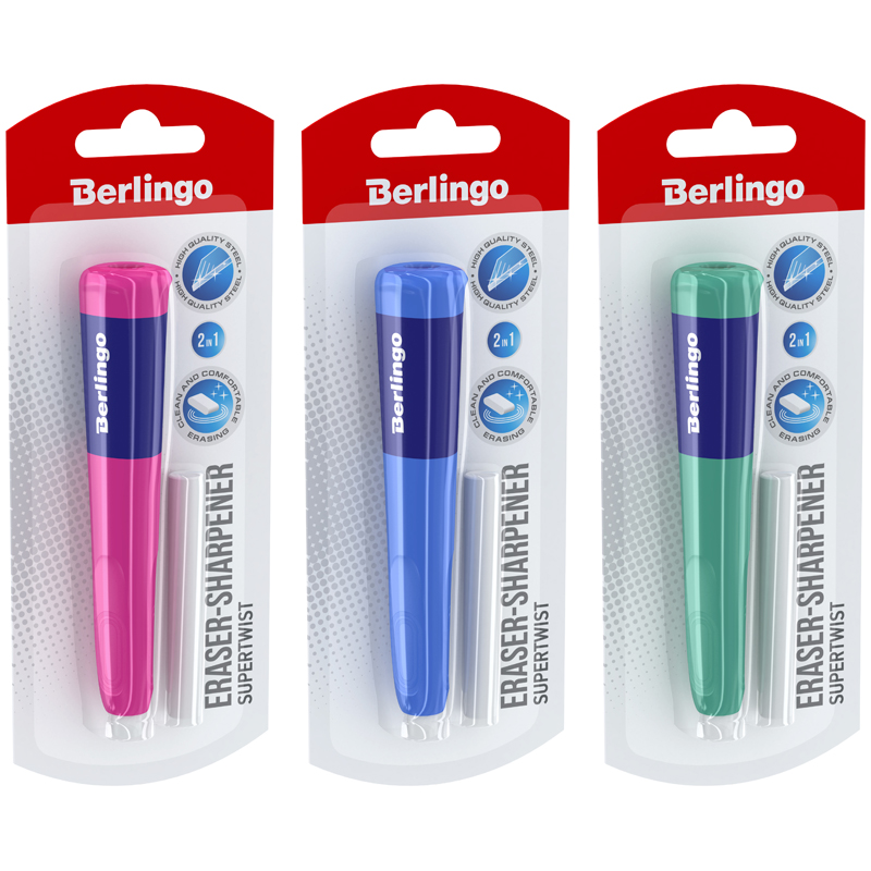 Точилка пластиковая с ластиком Berlingo "Supertwist" 1 отверстие, блистер, ассорти