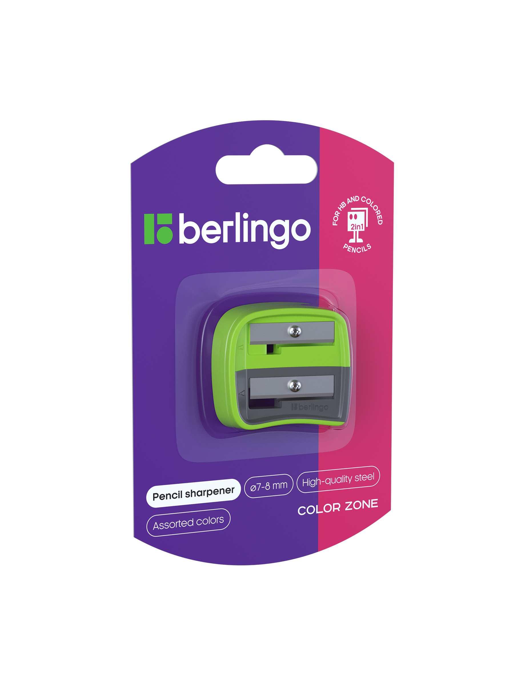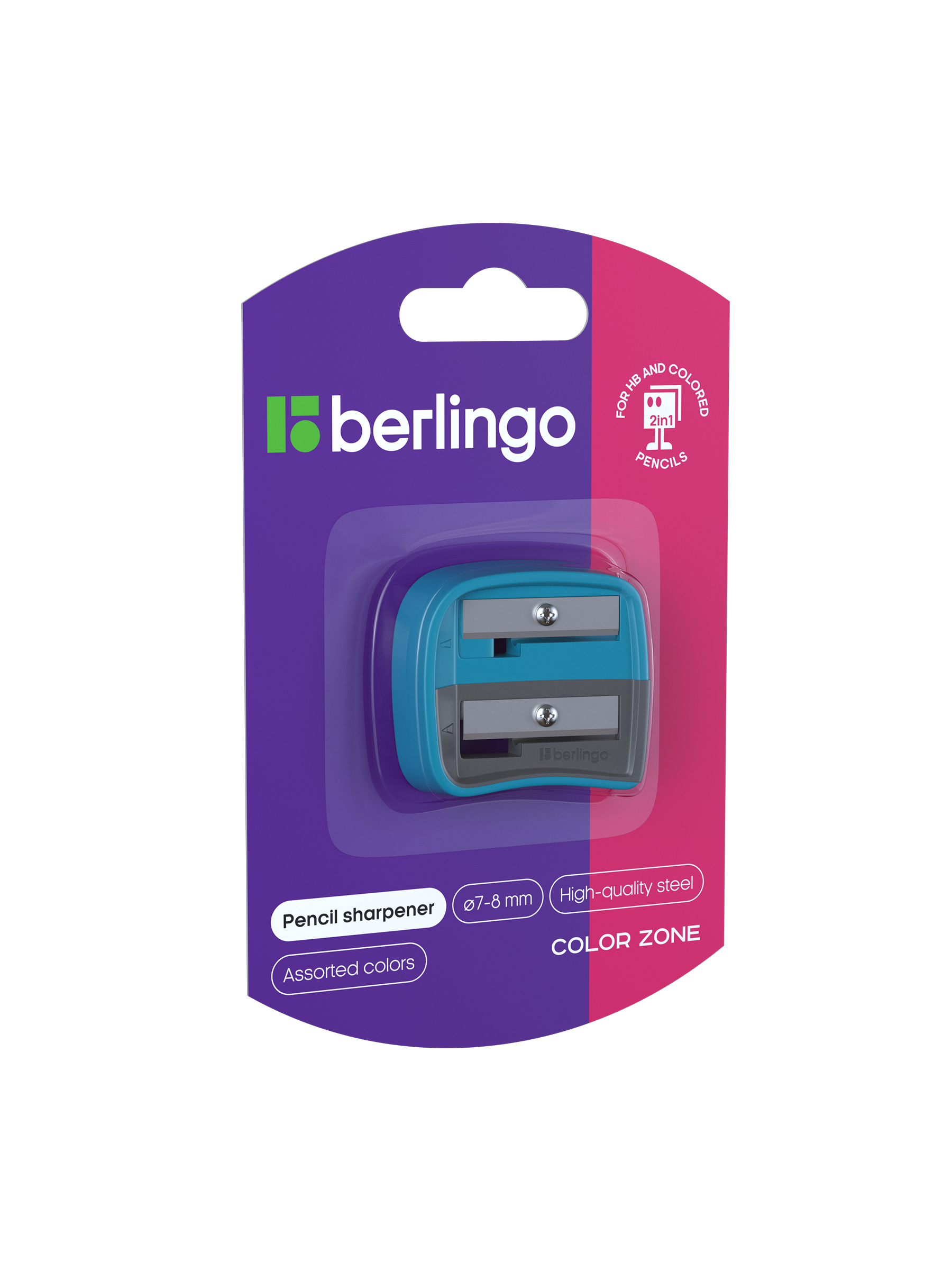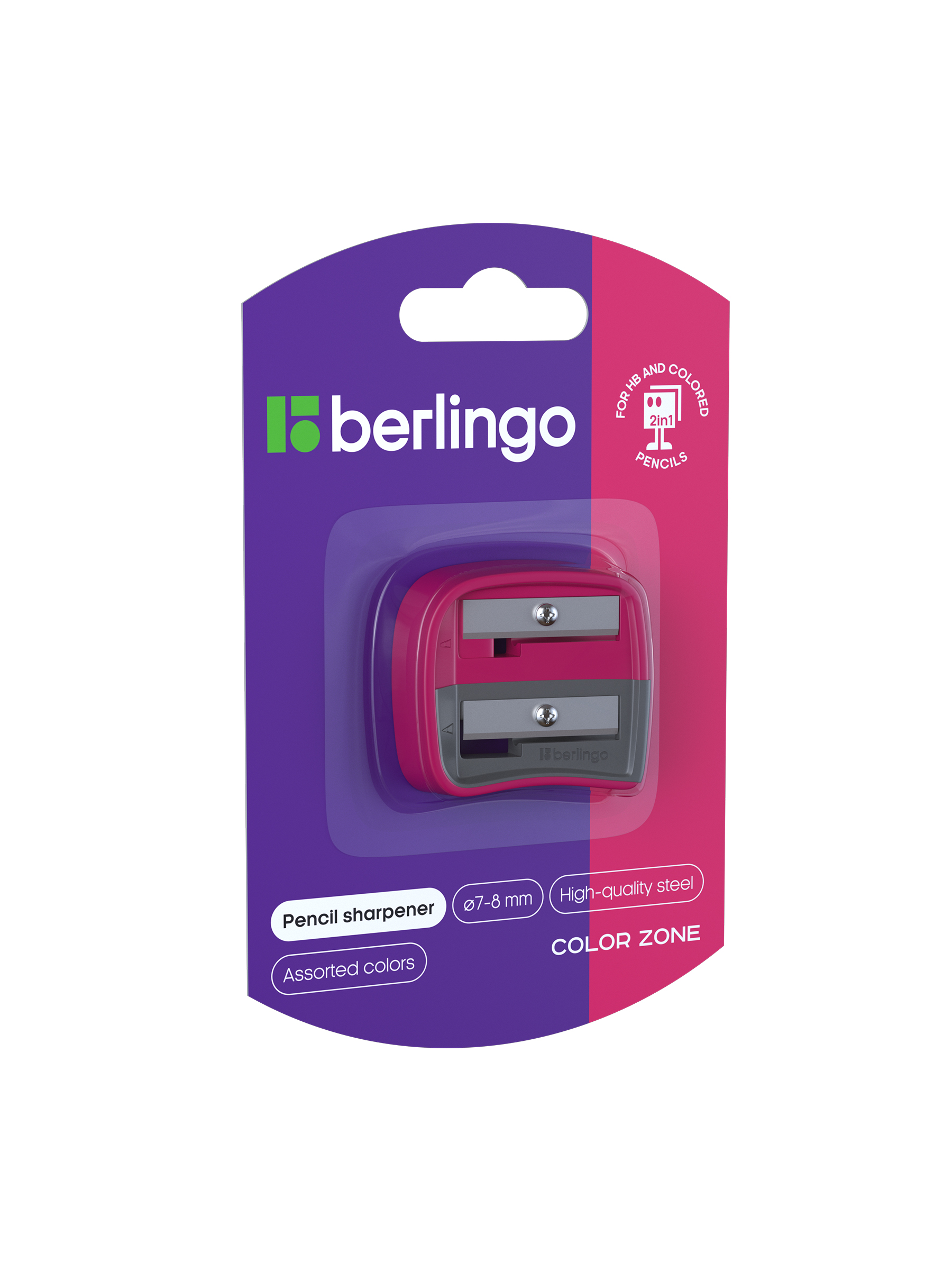 Точилка пластиковая Berlingo "Color Zone Duo", 2 отверстия, для цветных и ч/г карандашей, блистер, розовая