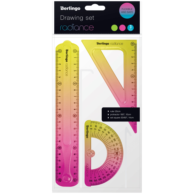 Набор чертежный средний Berlingo "Radiance" (треуг. 14см, линейка 20см, транспортир) гибкий, желтый/розовый градиент