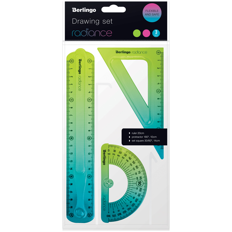 Набор чертежный средний Berlingo "Radiance" (треуг. 14см, линейка 20см, транспортир) гибкий, голубой/зеленый градиент