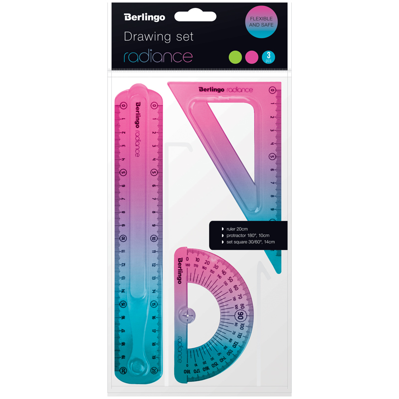 Набор чертежный средний Berlingo "Radiance" (треуг. 14см, линейка 20см, транспортир) гибкий, розовый/голубой градиент