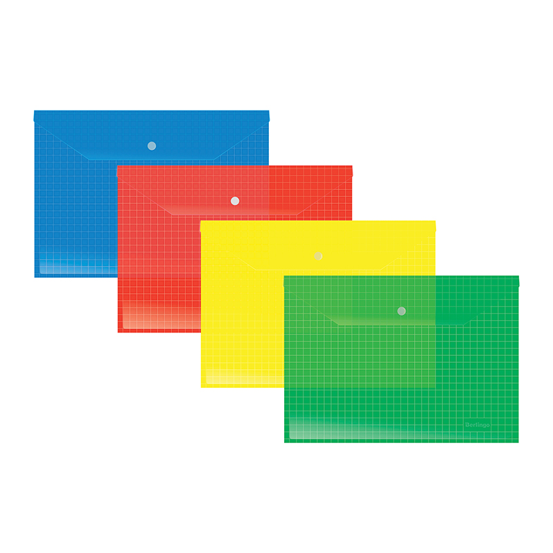Папка-конверт на кнопке Berlingo, А4, 140мкм, прозрачная, клетчатая запечатка, ассорти