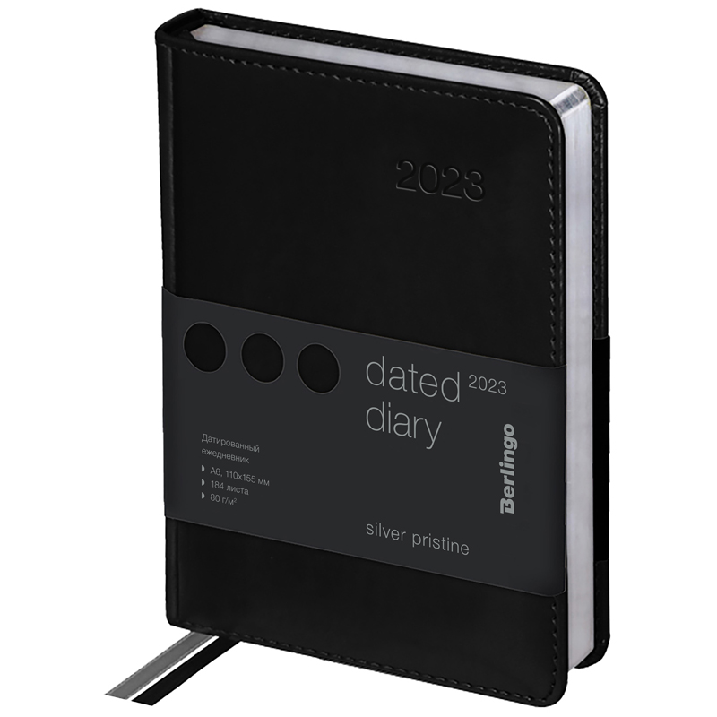 Ежедневник датированный 2023г., А6, 184л., кожзам, Berlingo "Silver Pristine", сер. срез, черный