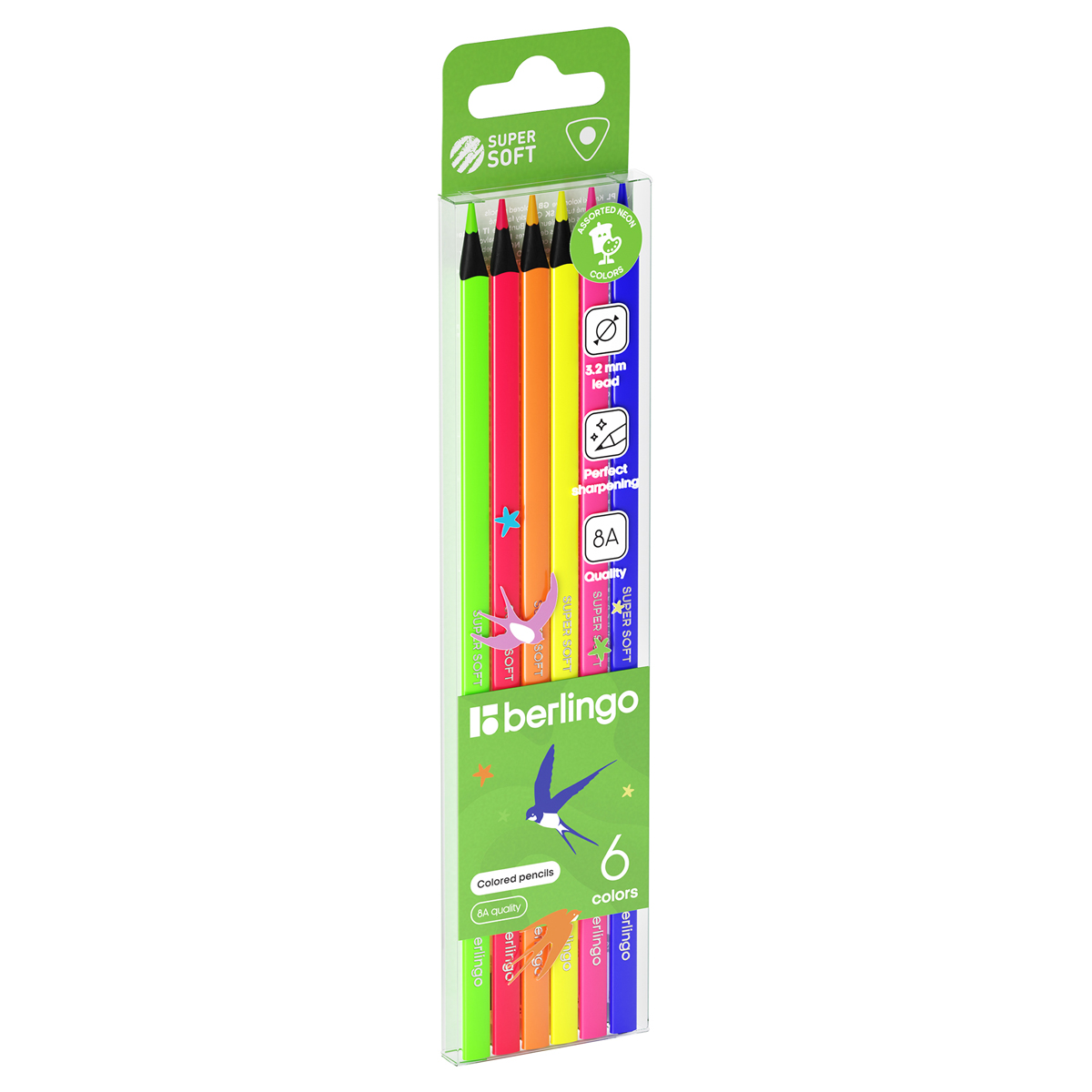 Карандаши цветные флуоресцентные Berlingo "SuperSoft. Fluo", 06цв., трехгран., заточен., европодвес