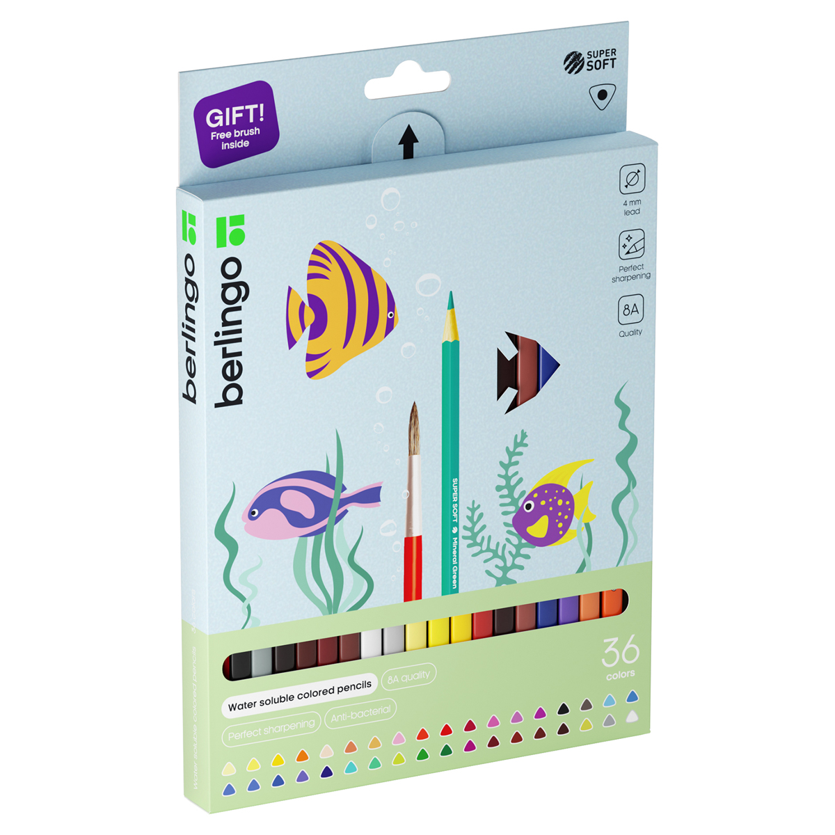 Карандаши акварельные Berlingo "SuperSoft. Рыбки", 36цв.+кисть, трехгран., заточен., картон, европодвес