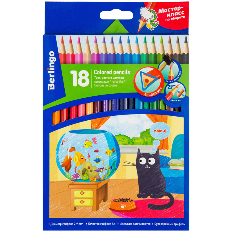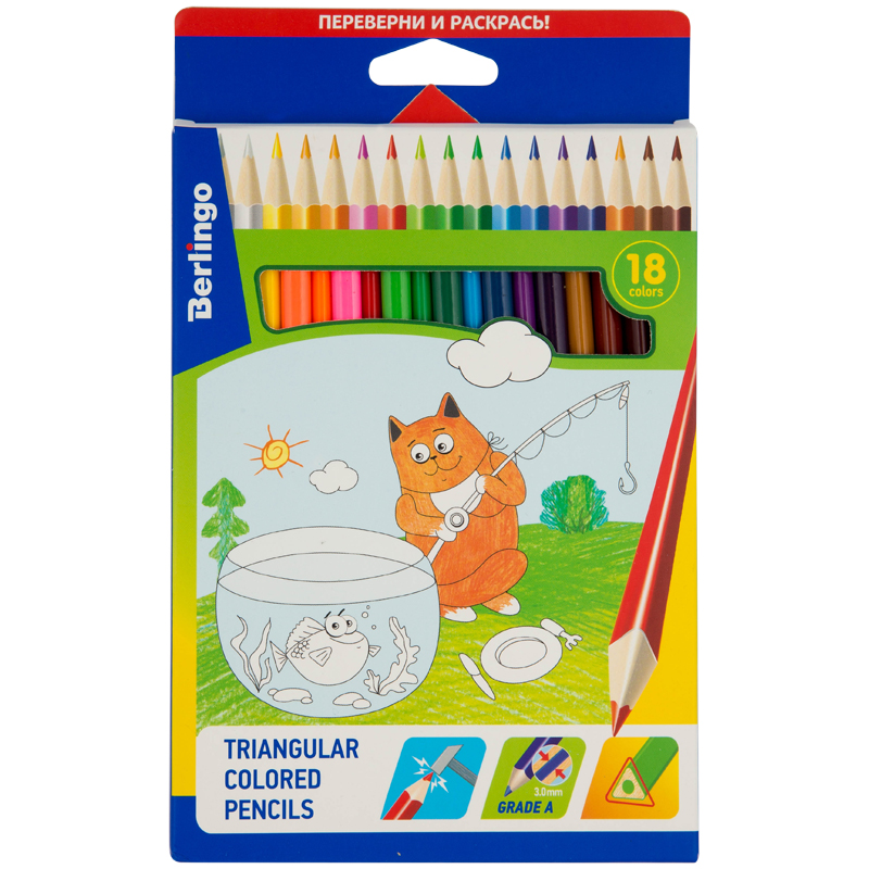 Карандаши цветные Berlingo "Жил-был кот", 18цв., трехгран., заточен., картон, европодвес