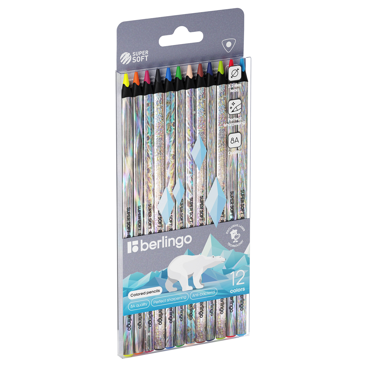 Карандаши цветные Berlingo "SuperSoft. Starlight", 12цв., трехгран., черное дерево, лазерная пленка, заточен., европодвес