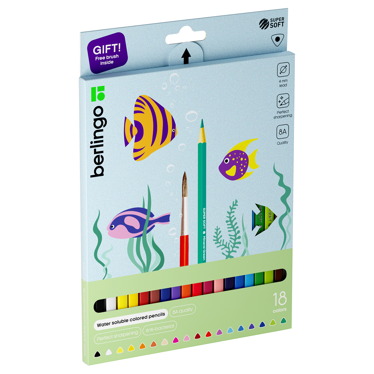 Карандаши акварельные Berlingo "SuperSoft. Рыбки", 18цв.+кисть, трехгран., заточен., картон, европодвес