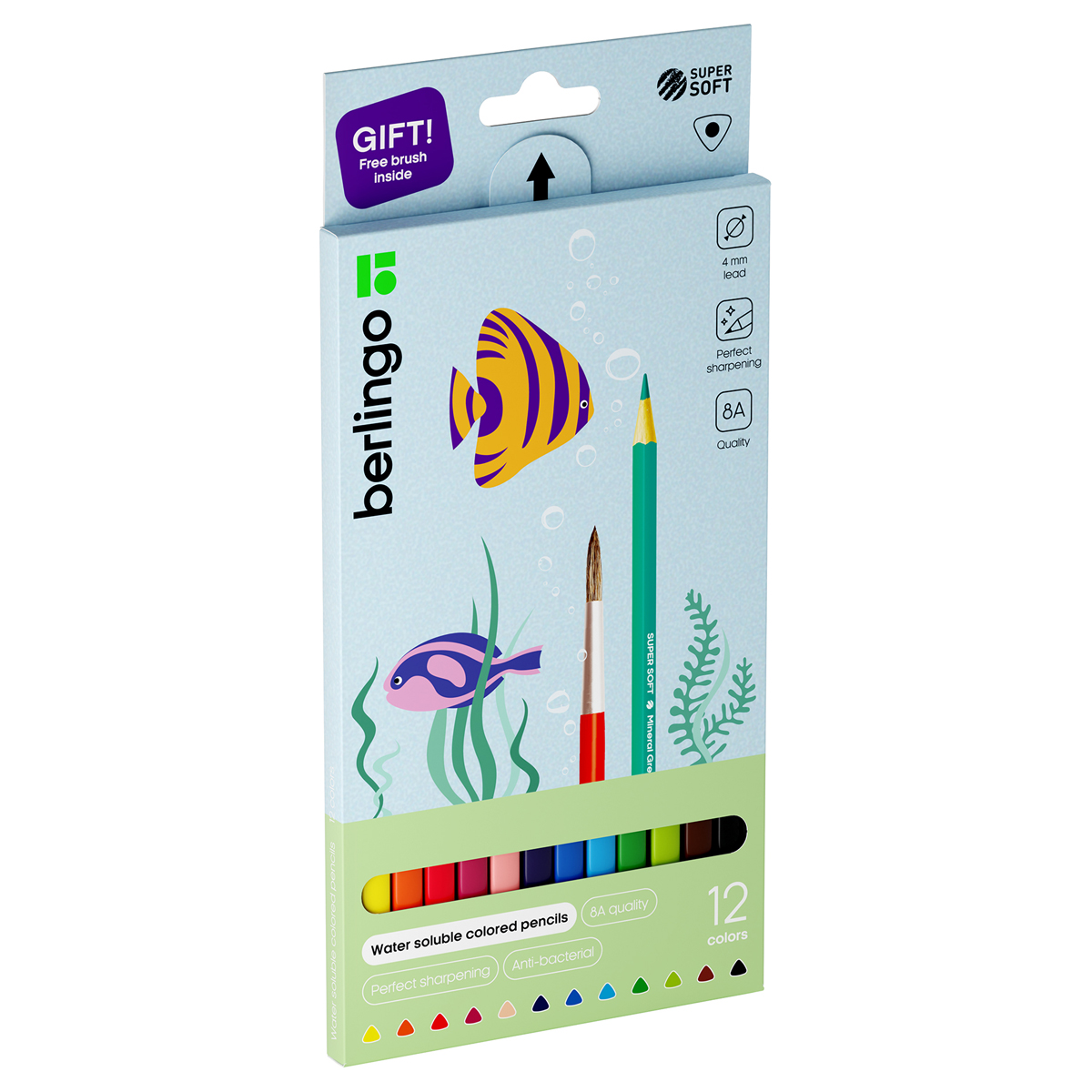 Карандаши акварельные Berlingo "SuperSoft. Рыбки", 12цв.+кисть, трехгран., заточен., картон, европодвес
