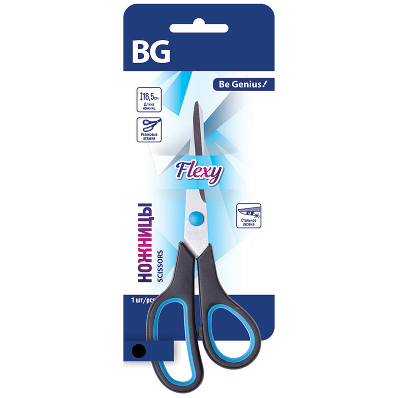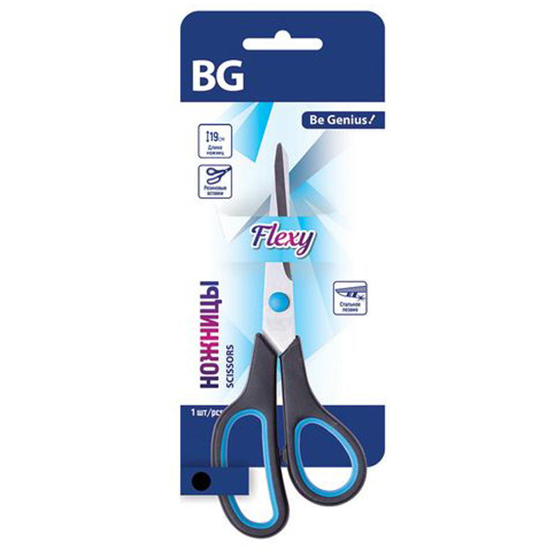Ножницы BG "Flexy" 19см, черные с синими вставками,стальное лезвие, европодвес