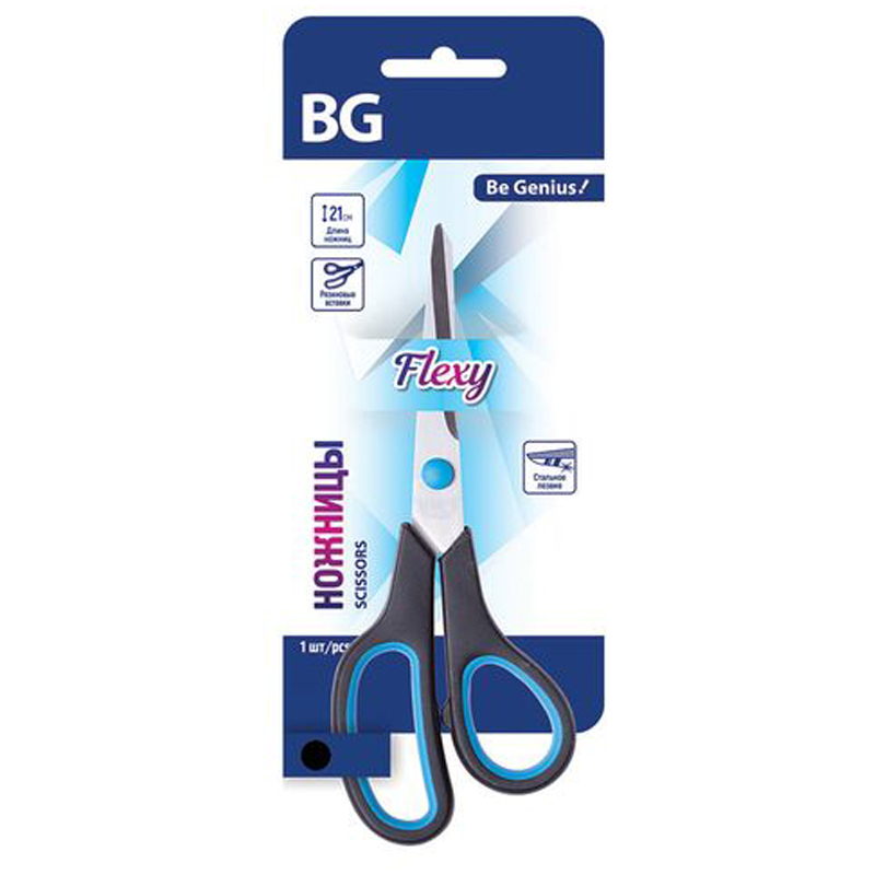Ножницы BG "Flexy" 21см, черные с синими вставками, стальное лезвие, европодвес
