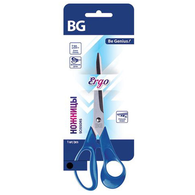 Ножницы BG "Ergo" 20см, синие, стальное лезвие, европодвес