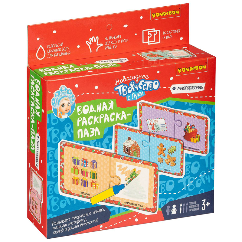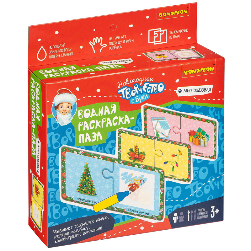 Новогодние пазлы-водные раскраски Bondibon, многоразовые, 16 карточек, 1 ручка