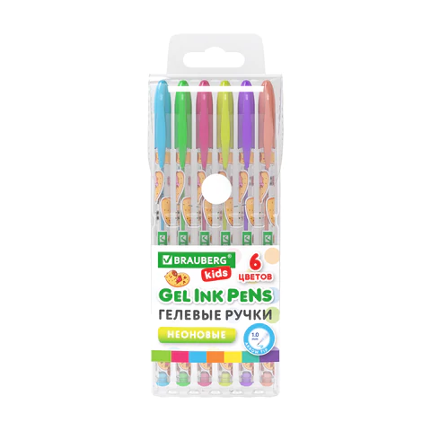 Ручки гелевые НЕОНОВЫЕ BRAUBERG KIDS "CUTE ANIMALS", НАБОР 6 ЦВЕТОВ, корпус с печатью, узел 1 мм, линия письма 0,7 мм, 144442