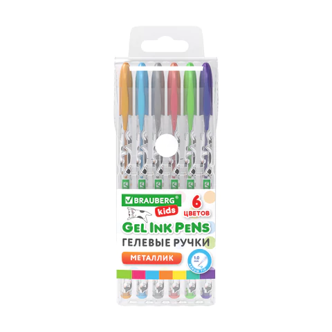 Ручки гелевые МЕТАЛЛИК BRAUBERG KIDS "CUTE ANIMALS", НАБОР 6 ЦВЕТОВ, корпус с печатью, узел 1 мм, линия письма 0,7 мм, 144440