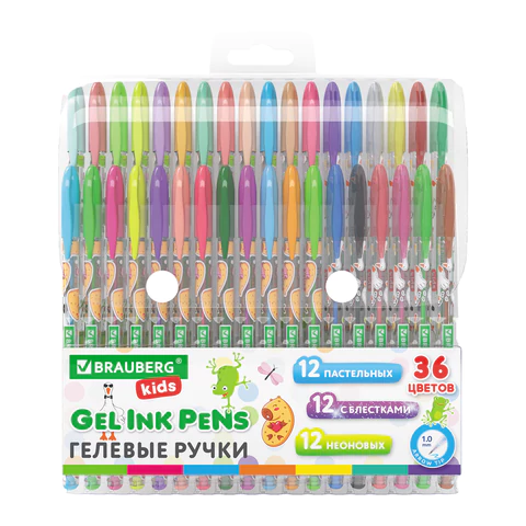 Ручки гелевые BRAUBERG KIDS "CUTE ANIMALS", НАБОР 36 ЦВЕТОВ, корпус с печатью, узел 1 мм, линия письма 0,7 мм, 144448