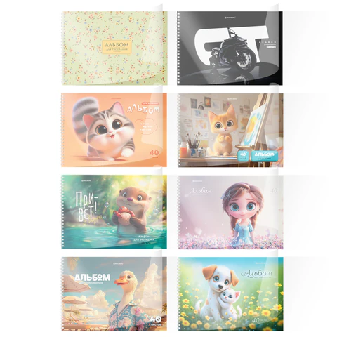 Альбом для рисования, пластиковая обложка, А4 40л., гребень, BRAUBERG, 210х297мм, АССОРТИ-1 (8 видов), 107682