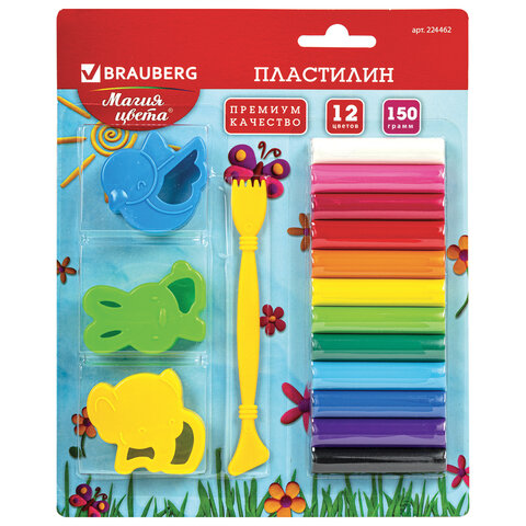 Пластилин классический BRAUBERG "МАГИЯ ЦВЕТА", 12 цветов, 150 г, стек, 3 штампа, ВЫСШЕЕ КАЧЕСТВО, блистер, 224462