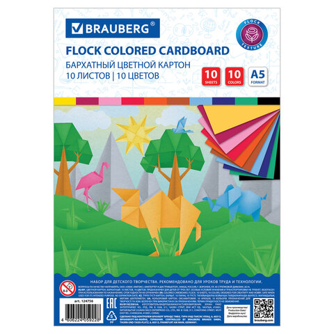 Картон цветной МАЛОГО ФОРМАТА, А5, БАРХАТНЫЙ, 10 листов, 10 цветов, 180 г/м2, BRAUBERG, 124756