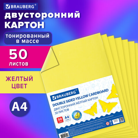 Картон цветной А4 ТОНИРОВАННЫЙ В МАССЕ, 50 листов, ЖЕЛТЫЙ, 220 г/м2, BRAUBERG, 210х297 мм, 128985