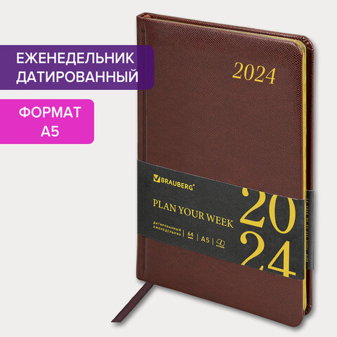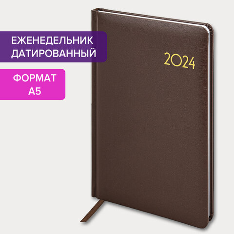 Еженедельник датированный 2024 А5 145х215 мм BRAUBERG "Select", балакрон, коричневый, 115036