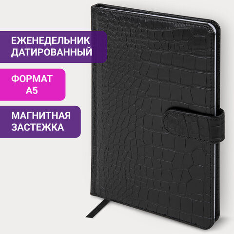 Еженедельник датированный 2024 А5 145х215 мм BRAUBERG "Party", под кожу, черный, 115033